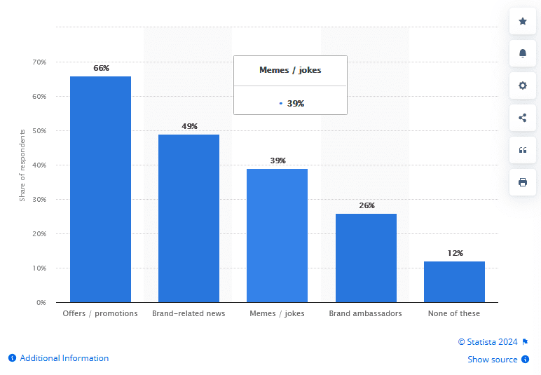 In addition to all these benefits, data from Statista shows that among all the content types that a brand can share on social media, memes are some of the most effective in building positive brand perception. The chart below shows the social media activities that lead to positive brand perception according to Gen Z consumers in the US.