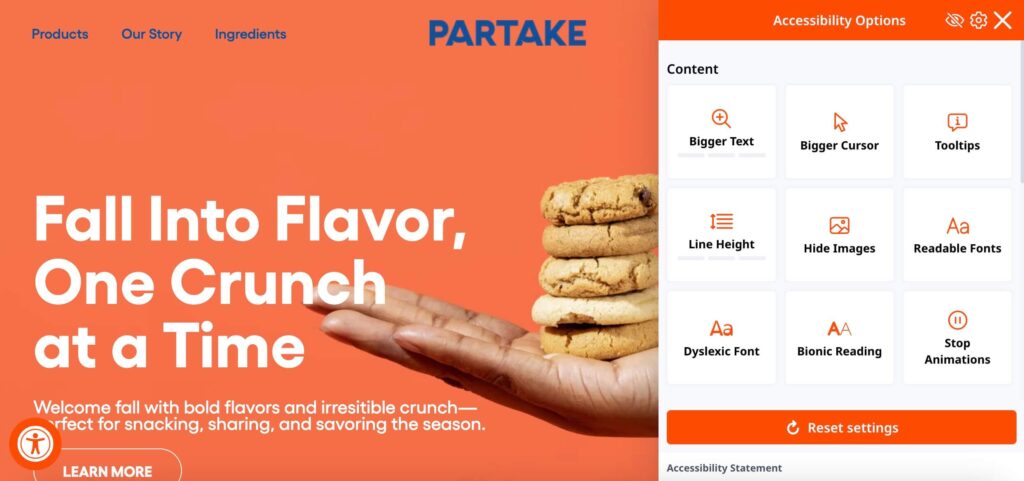 For example, the website of Partake Foods, known for their non-GMO, vegan cookies, displays a dedicated accessibility button at the bottom the page. Clicking that brings up a menu that lets users customize what’s visible on the screen. There’s even an option to switch to a font that’s easy for Dyslexic users.