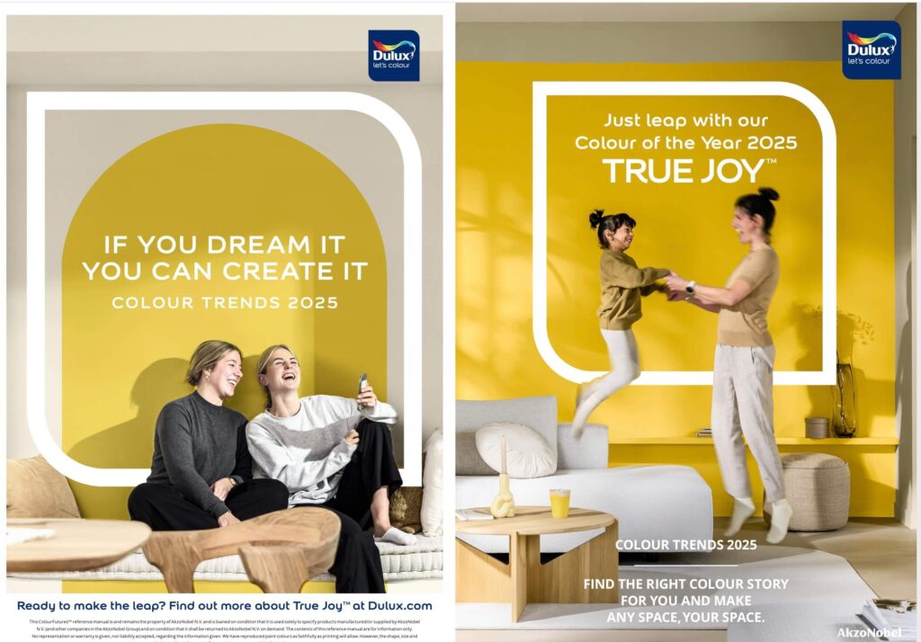 To begin with, there is True Joy, the paint color picked as the Color of the Year 2025 by AkzoNobel that owns brands like Dulux. This sunny yellow was chosen by the brand as a “joyful leap into the unknown”.