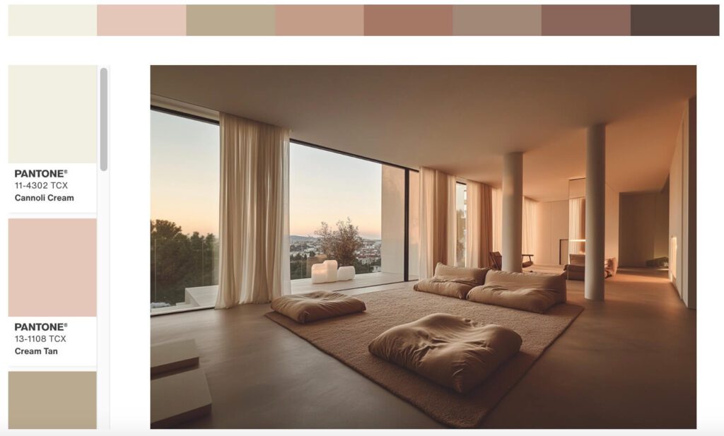 The cozy comforting interior design featured as an example on the Pantone website exemplifies the calming effect of this palette. From the grounding effect in the first palette on our list to the subtle understated tone in this palette Mocha Mousse truly can be optimized for a variety of aesthetics.