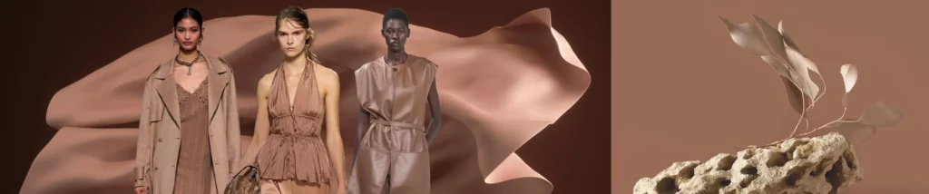 This is a nature-inspired palette bursting with soft colors for a more “organic” feel. Here Mocha Mousse fits between the cold Cornflower Blue and the warm Rose Tan creating a more nature-focused aesthetic. The palette therefore underscores the earthy elegance of Mocha Mousse. This palette highlights the significance of Mocha Mousse for brands focused on sustainability and the use of natural and organic ingredients.