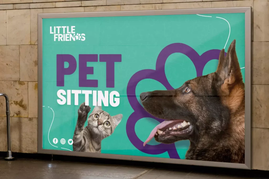 When featuring human or animal subjects in the design, there are even more subtle ways to add directional cues. From the gaze of the subject directed in the required direction to the subject pointing toward the element in focus, the options are endless. For instance, in the design here, the dog’s gaze and the cat pointing toward the service offered ensure that the message is loud and clear.