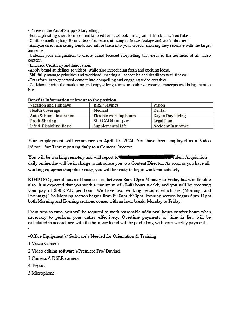 - KIMP NEVER asks prospective or existing employees to deposit and subsequently transfer funds.