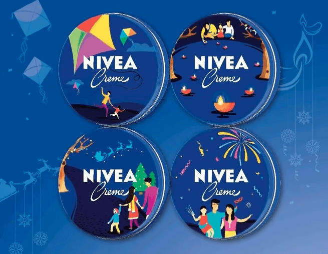 Nivea introduced a limited edition winter range in India with the below adaptable design. The designs were to celebrate the four main holidays in India in winter, namely Diwali, Christmas, New Year, and Makar Sankranti.