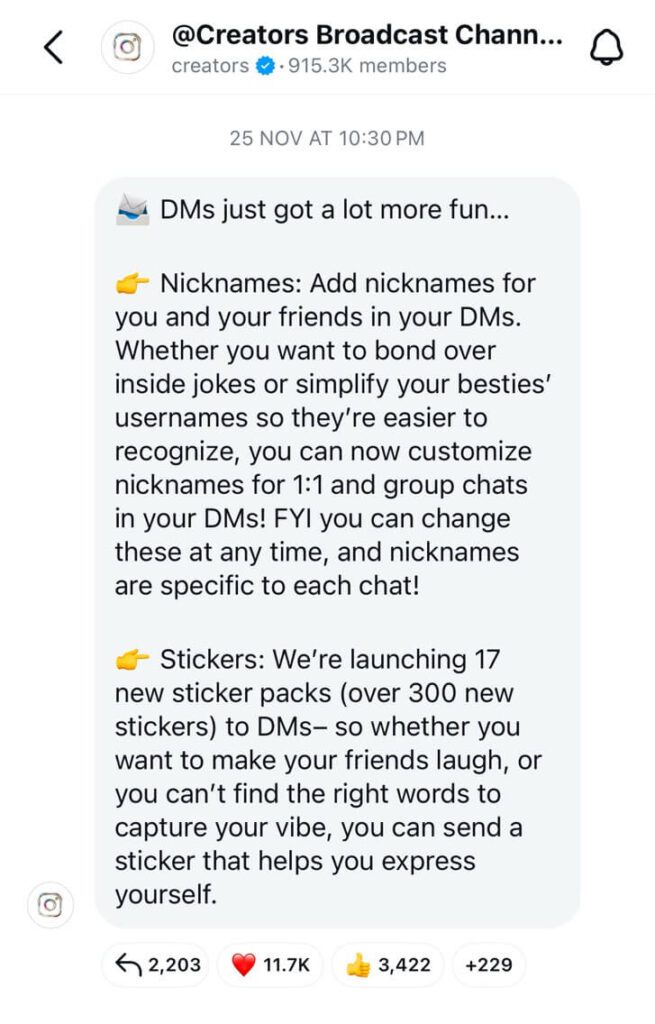 Here is a snapshot of the broadcast channel of Creators on Instagram. This is where Meta shares quick updates with creators who are looking to make the most of the platform.