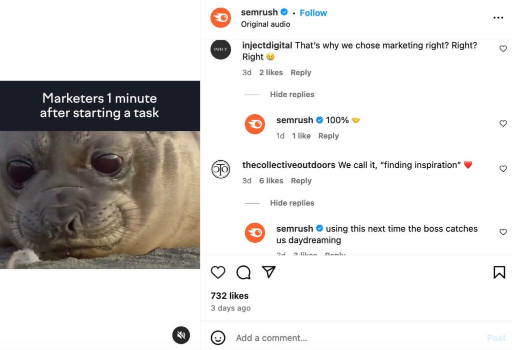 For example, the post here from Semrush prioritizes engagement rather than promotion. It delivers content relatable to the brand’s target audience, marketers. Therefore the engagement on the post is good and Semrush’s replies to the user comments enhance the impact of the post.