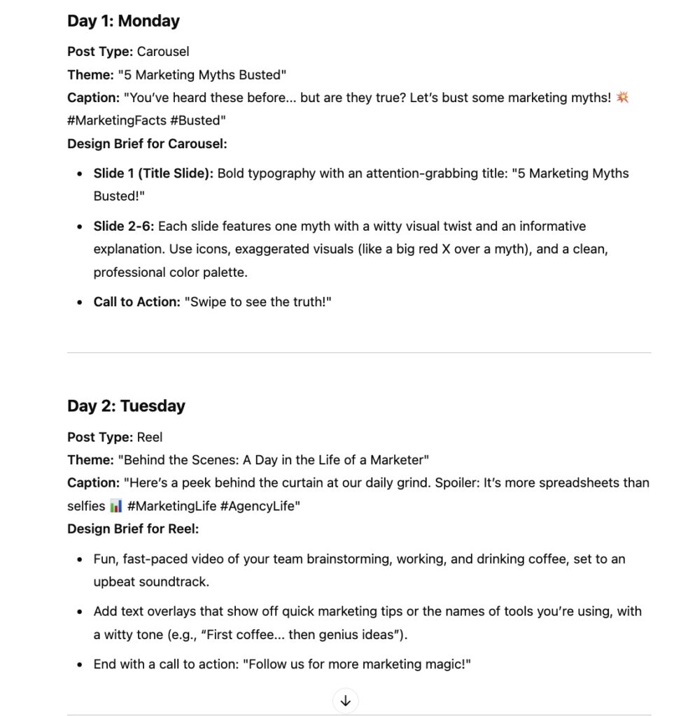 For example, we asked ChatGPT to come up with a week’s worth of content ideas for the Instagram page of a marketing agency. We also mentioned the required tone and other details to fine-tune the results and here’s a sample of ChatGPT’s response.
