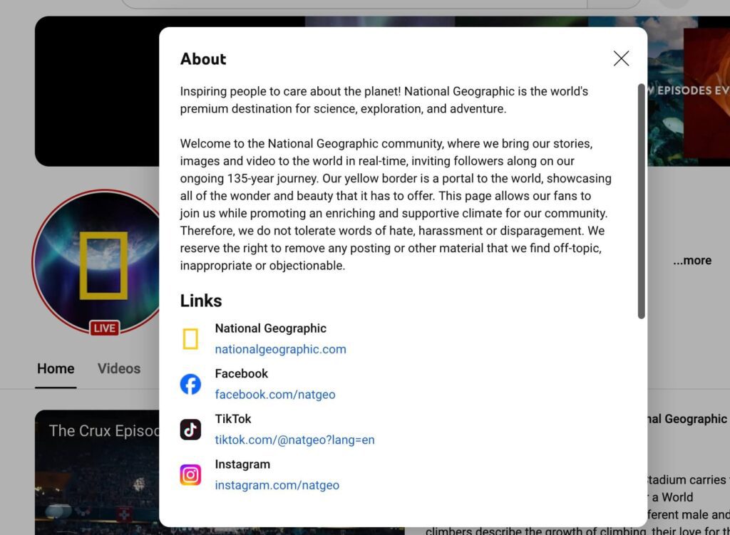 For example, here’s a snapshot of the National Geographic YouTube channel. From subtly establishing the heritage of the brand to giving cues about what the brand stands for and what the channel is about, this About section delivers all the essential details to create a lasting impression on your channel visitors.