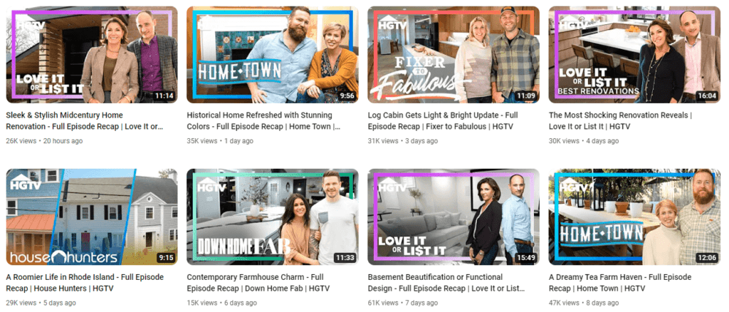 The below image gives a glimpse of the HGTV YouTube channel. Notice how the brand sticks to a single recognizable template but uses different fonts to differentiate between the themes.