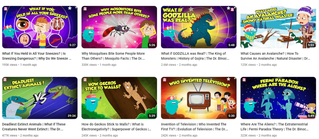 The below image shows the thumbnails used in a YouTube channel called Peekaboo Kidz. As evident as it might be, the target audience here is children. Therefore the visuals and the fonts are all chosen to resonate with little kids.