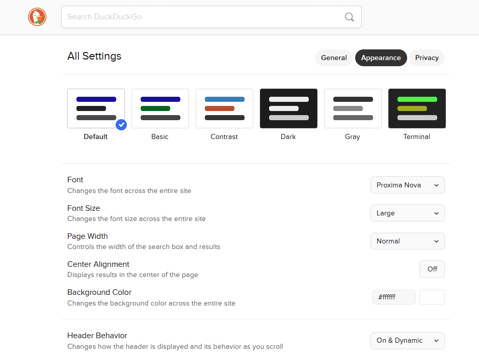 Combining the other UX design trends and this one, you could also aim to provide users with better control of the display settings on your website. Renowned privacy products company DuckDuckGo has an intuitive user-friendly website that allows users various ways to customize the appearance of the website for a more convenient experience.