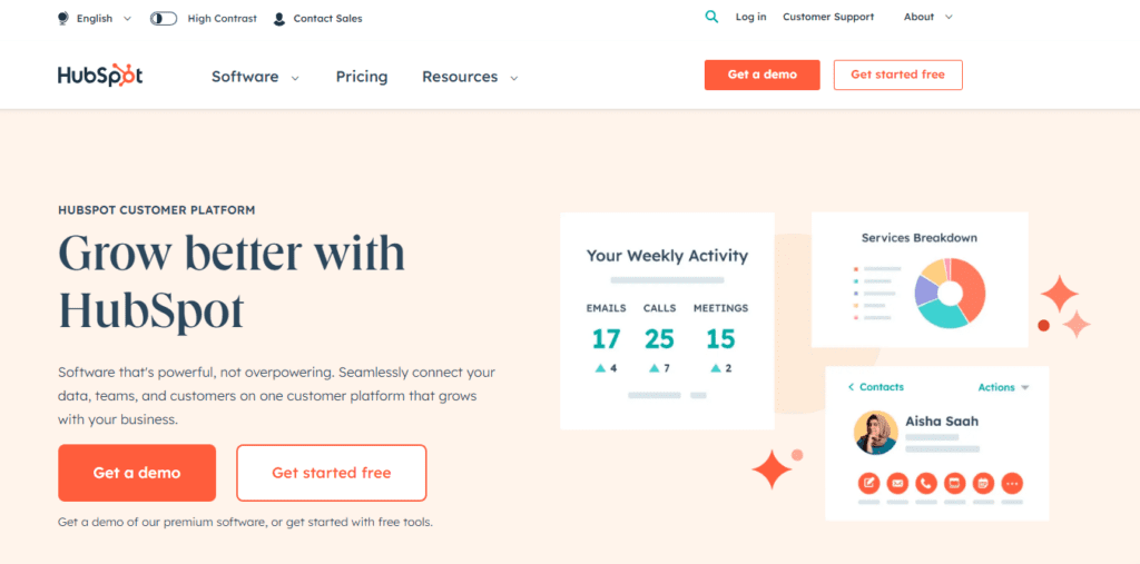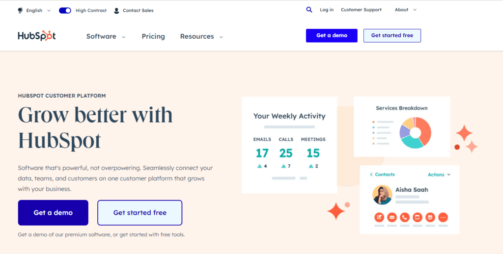 - Pay attention to color contrast especially to allow users to understand interactions and feedback. The HubSpot website displays a toggle button on top of the page to allow users to switch to a high-contrast mode for better accessibility. The first image below shows the regular page and the second image is in the “High Contrast” mode.