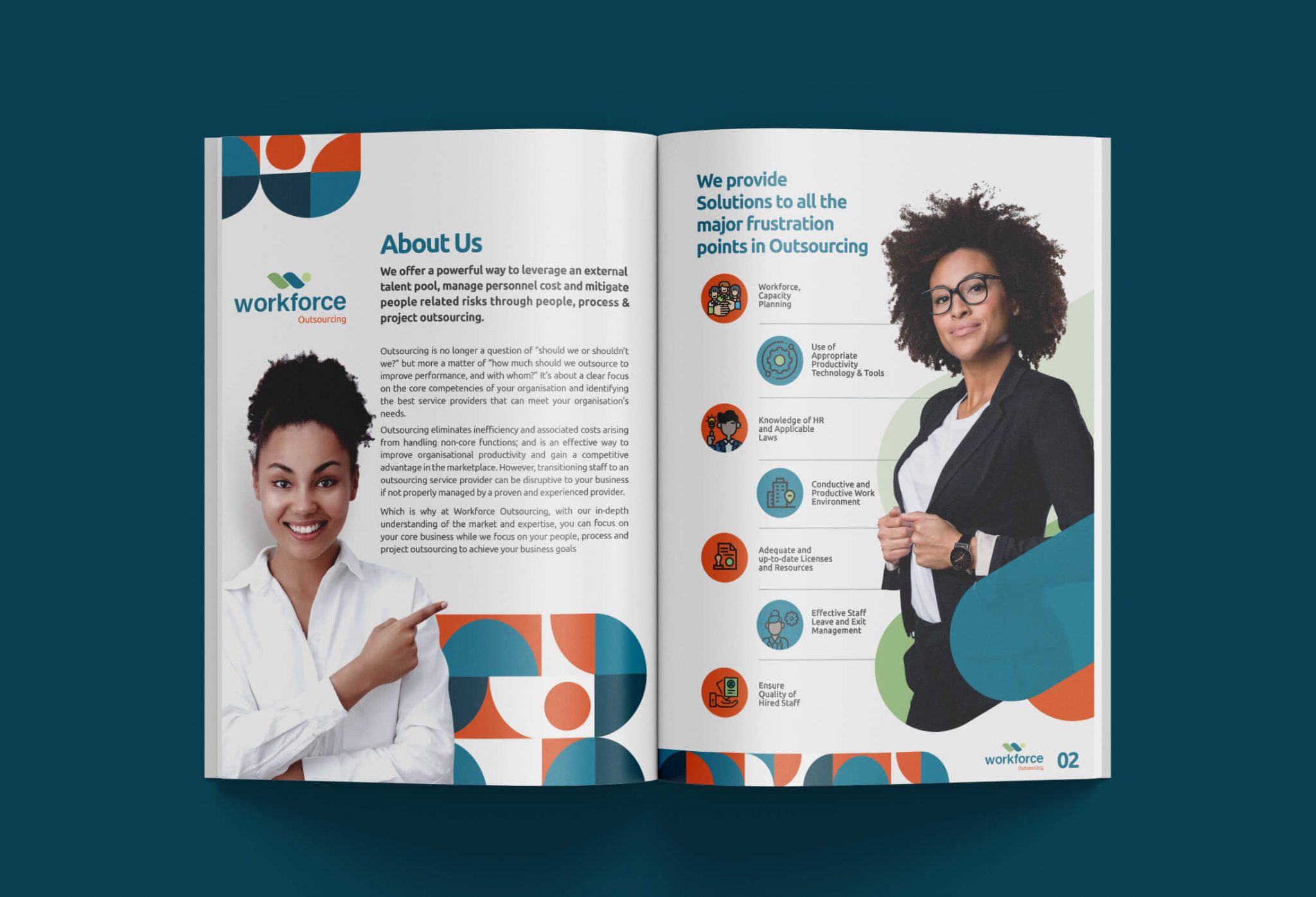 The orange, teal and blue elements are added on each side of the design to create continuity and unity. If the elements were only on one side, the design would have looked offset when only partly unfolded. Little details like these determine whether your overall brochure design looks coherent or not. You will not want a design that looks great in individual panels but clumsy and disconnected when placed in the intended layout.