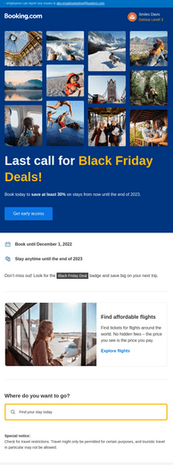 The marketing emails from Booking.com are classic examples of this strategy. As can be seen from the below example, the brand uses persuasive language and scarcity tactics, tapping into the brain’s inherent fear of missing out (FOMO).