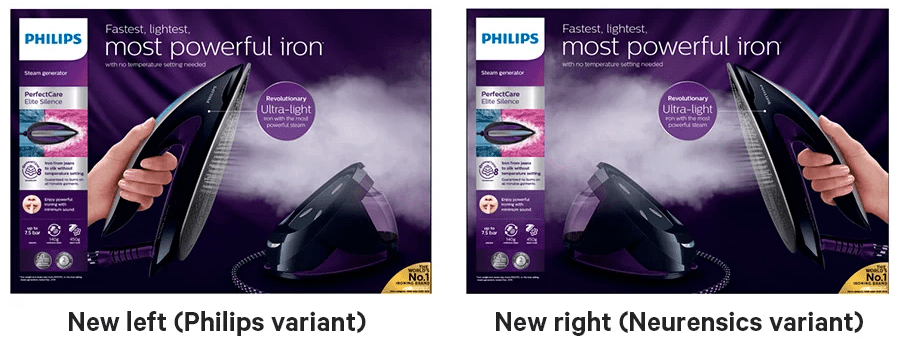 To reiterate this, we’ll take a look at an experiment by Philips. By utilizing brain imaging techniques like fMRI, researchers compared two packaging versions—one featuring a left-handed iron and the other with a right-handed iron grip.