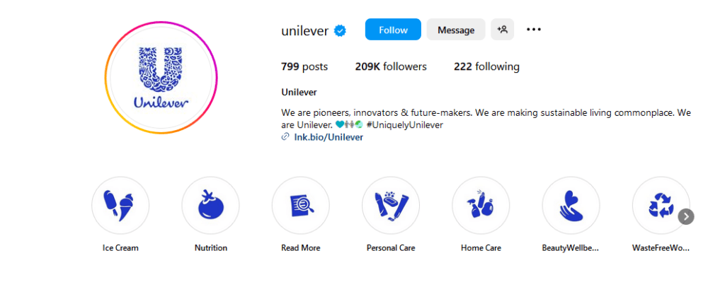 Furthermore, if you look at the symbols used in the logo, they are illustrated in a unique style which also brilliantly aligns with the illustration style the brand uses in several other places in its marketing designs. The below snapshot shows the Highlights section of the Unilever brand’s Instagram page.