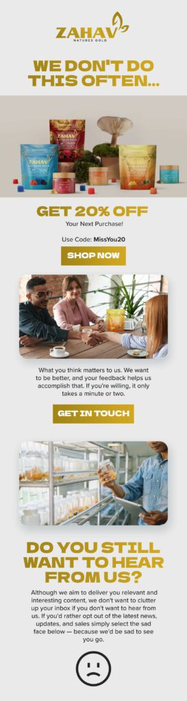 The below email impresses in terms of the content and the design that captures the core message. From a special discount code to a request for feedback and a quick option to unsubscribe, this email encompasses all the essential elements that make a good re-engagement email.