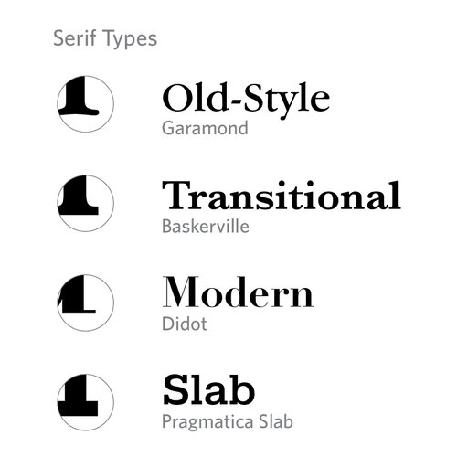 They have a serif or a small stroke extending out of the letter. Times New Roman, for example, is a serif typeface. Within serif typefaces, there is old style, transitional, modern, and slab serif.