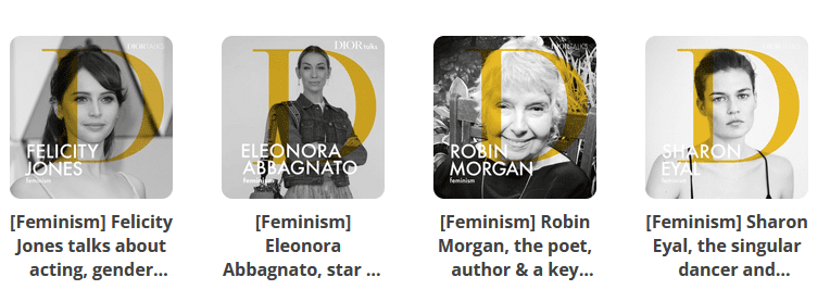 Dior Talks from the popular luxury brand Dior exemplifies the effectiveness of interview podcasts. This consists of a series of interviews of prominent people within Dior as well as influential celebrities and more.