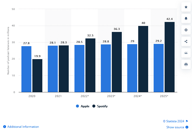 The below graph from Statista shows the steady growth of podcast listeners on Apple & Spotify. Clearly, Spotify is getting ahead in the podcast game and encouraging several brands to invest in audio.