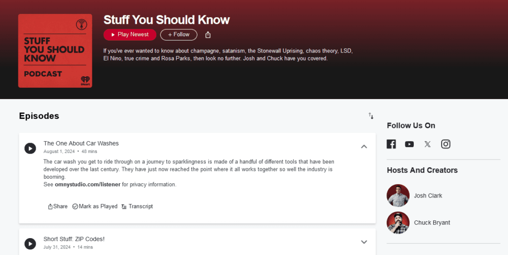 The different personalities of the hosts add different dimensions to the podcast and therefore make each episode unique and engaging. Stuff You Should Know is another great example of providing listeners with information but in a conversational and fun manner.