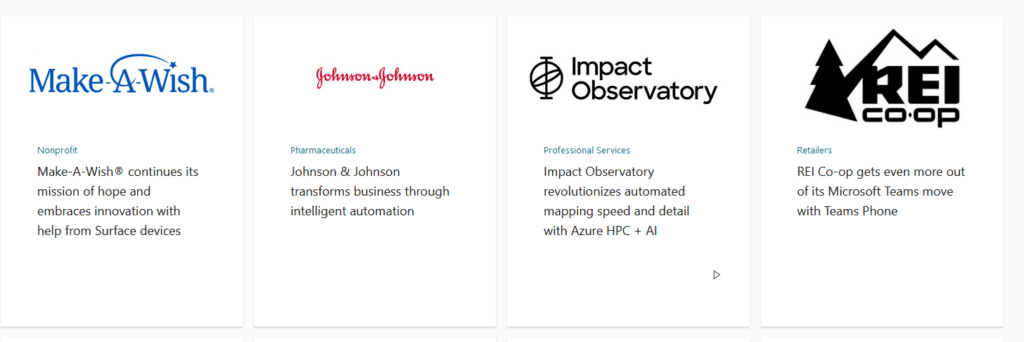 The below image shows a snapshot of some of the case studies featured on the Microsoft blog. As can be seen, featuring the respective brand names and logos makes it easy for a reader to get a quick glimpse of the clientele.
