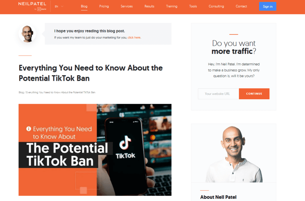 For example, Neil Patel’s Digital Marketing Blog is one of the best-ranking blogs for anyone looking for quick insights into digital marketing. Amidst informative content, he regularly shares posts that talk about the current trends in social media and marketing. Like the post here talking about the potential TikTok ban which was recently one of the hottest topics of discussion.