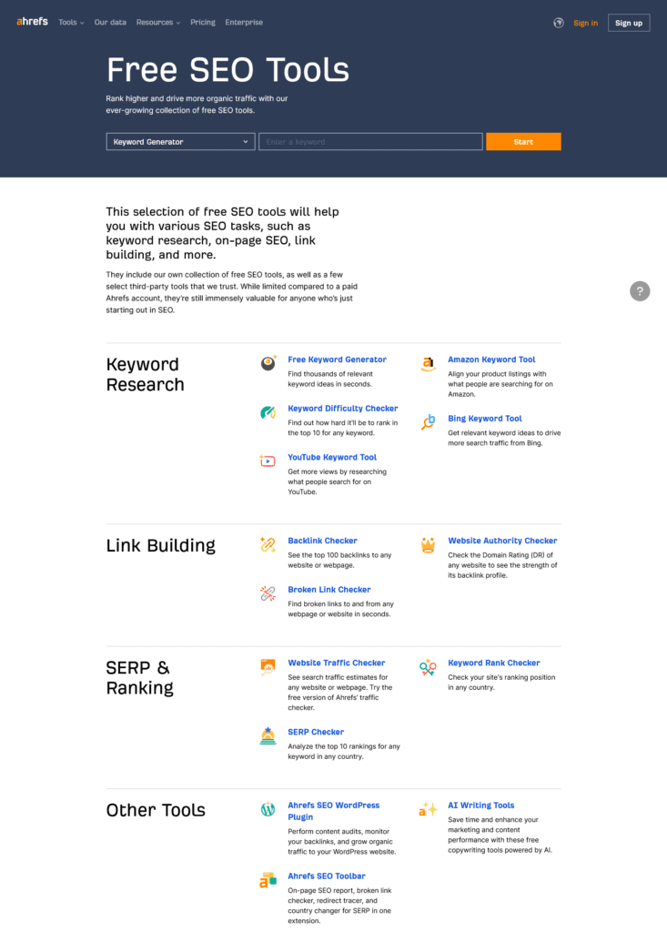 For example, Ahrefs, a leading SEO software company, offers a suite of free SEO tools for keyword research, link building, SERP, and more.