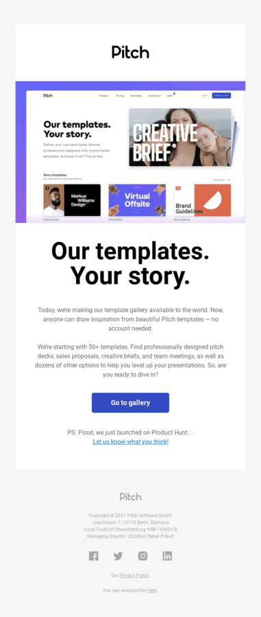 But yes, remember that you also need to promote these templates through the right channels to ensure that you reach the right people. For instance, the popular presentation software provider, Pitch promotes their templates through emails.