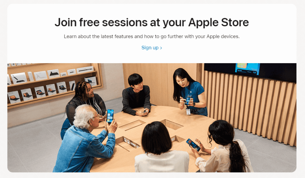At this point, Apple’s free live sessions at various Apple Stores are a good example. They host a variety of events to educate customers about new products and features. Additionally, there are also live online personal sessions available for customers who are looking for information on Apple devices or on the latest features.
