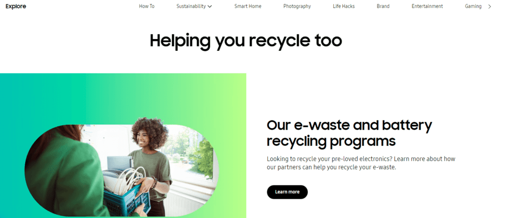 Samsung offers recycling services to its customers. This one caters to the niche audience segment of eco-conscious consumers. Through this program, the brand allows customers to turn in their old electronics, appliances, and mobile products therefore allowing them to responsibly tackle the problem of electronic waste. The idea also helps improve their brand image by establishing Samsung as a brand that takes sustainability seriously.