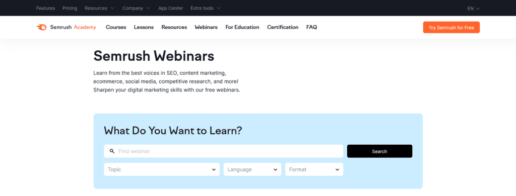 For example, Semrush, the popular SaaS platform offering online marketing services, offers a wide range of free webinars on various topics in SEO, ecommerce, content marketing, and more. Again, similar to our previous example, these are topics catering to the types of audiences that Semrush targets. Therefore if these customers find the webinars from Semrush to be relevant and useful to them, they are more likely to consider Semrush’s services.