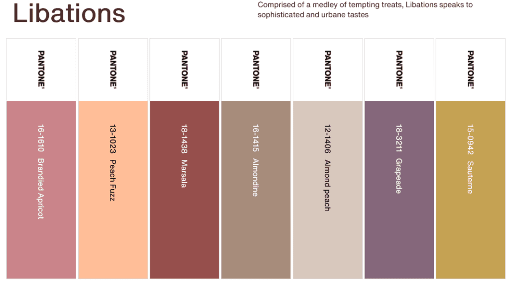 If you are looking for something elegant without any loud colors to break the minimalistic tone of Peach Fuzz, then Libations is the palette to try.