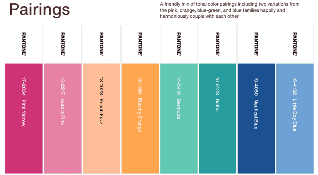 For those brands that flaunt vibrant designs, Pairings is the perfect palette that builds on a tetradic combination of peach with deep blue, teal, and a touch of yellow. As can be seen from the image below, this palette perfectly balances the warmth of Peach Fuzz and Blazing Orange with the cool tones of Nautical Blue along with gentle layers of Aurora Pink and Little Boy Blue.
