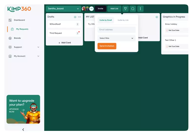 Invite team members to your KIMP360 board and choose whether they will be admins, associates, or simply have viewer access.