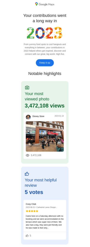 So, yes, when personalized engagement is the goal, this is one of the most effective marketing strategies for brands to focus on. Take, for example, the below email from Google. Personalized email campaigns like this one are known to boost transactions by about 6 times when compared to generic ones.