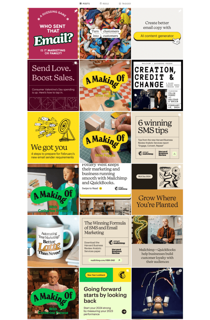 - Remember that you often get just one shot at making a strong impression on your audience. So, make that count – by adding catchy visuals. These could be in the form of engaging cover images and profile pictures on Facebook and LinkedIn, aesthetic video cover images on YouTube, and a cohesive grid aesthetic on Instagram. Like the one adopted by Mailchimp.
