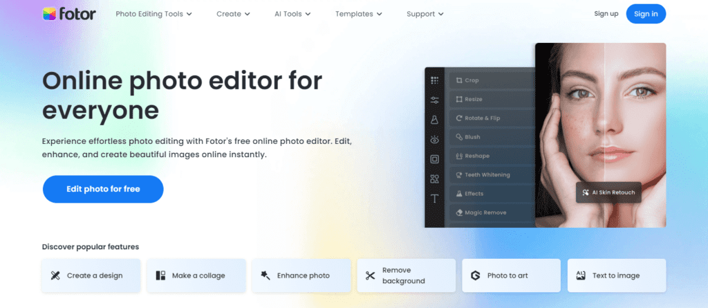 Fotor comes with a whole suite of photo editing tools, design tools, and AI tools. With a lot of basic and advanced editing features as well as templates for popular design formats, this tool is great for designers and non-designers alike.