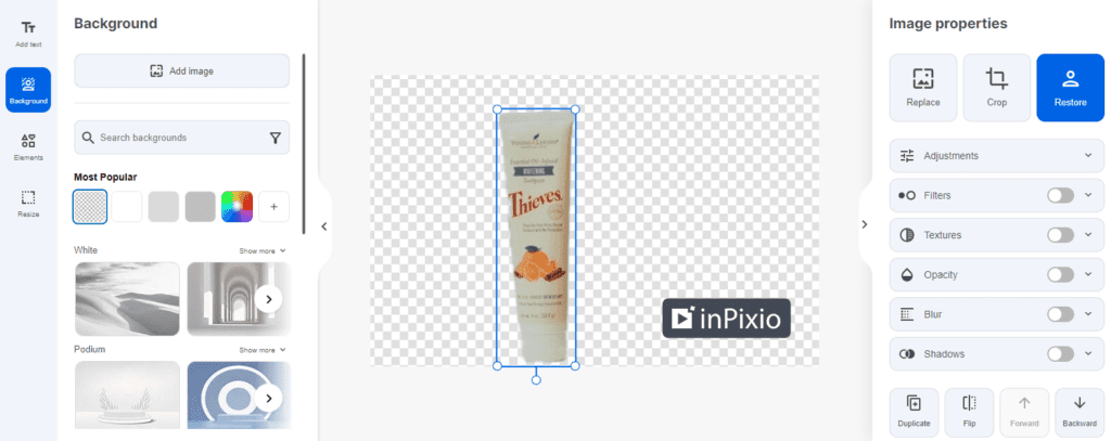 The inPixio tool retained most objects in the background and there is no straightforward option to erase portions of the image.