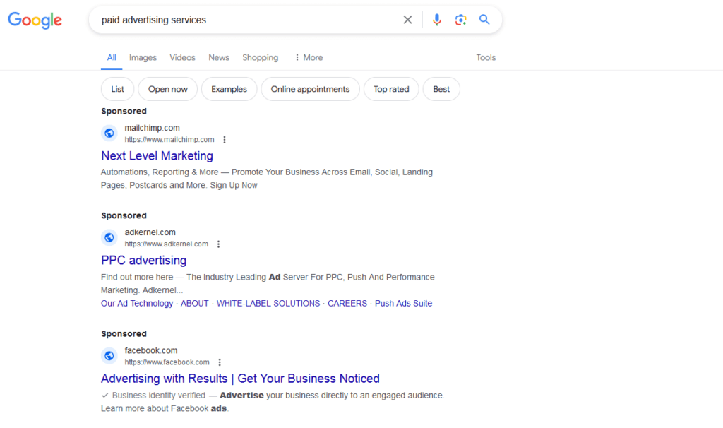 If it’s for Google Ads, you need thorough keyword research to craft a compelling copy for your ads. This ensures that your ads appear in relevant search results. Here’s a snapshot of some ads appearing at the top of the search results page on Google Search.