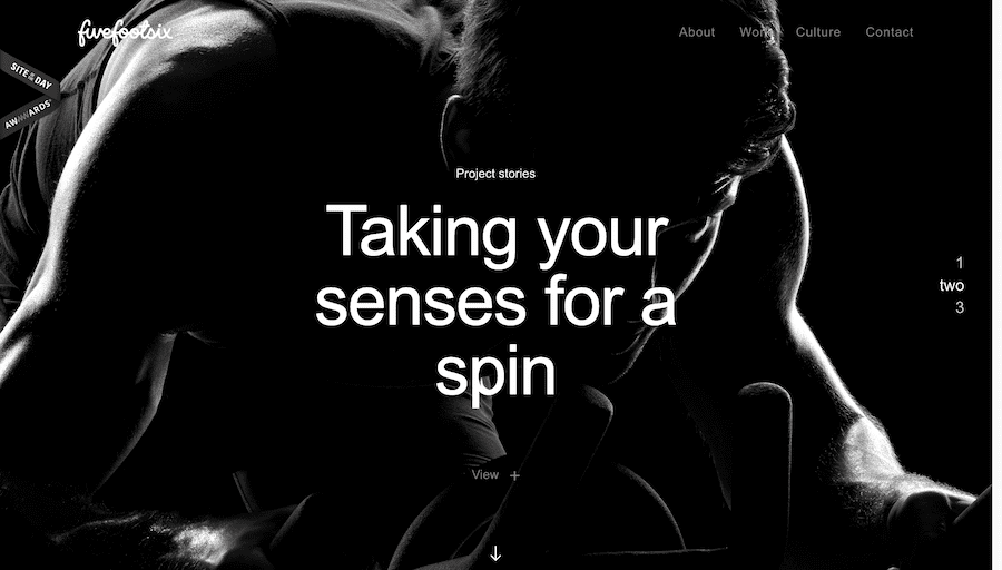 This hero image design from the brand Fivefootsix is a full black screen that has a highlighted slogan which is placed right in the centre. The nature of this design and the text placement immediately draws your eye to it.