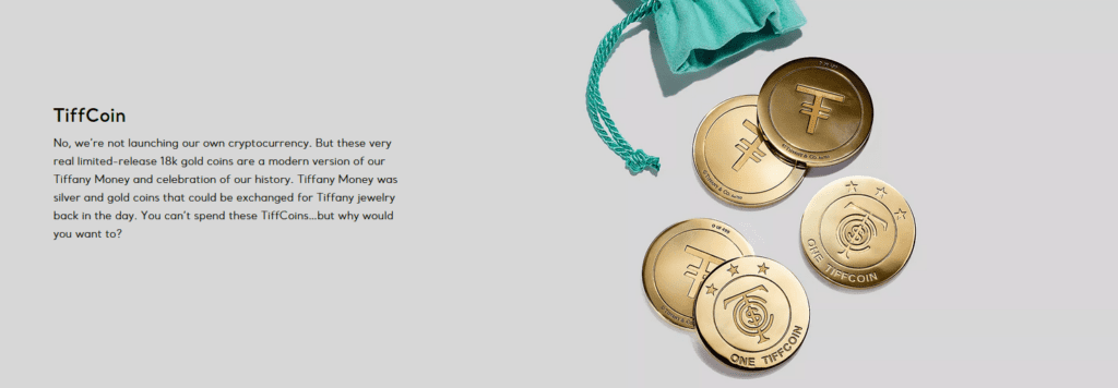 Tiffany & Co. added a post announcing Tiffcoins, their venture in the world of cryptocurrency. On visiting the landing page linked, visitors could get the message that there was actually no cryptocoin to purchase. But these coins were made available as real gold coins that could be purchased as a limited edition collection on the website.