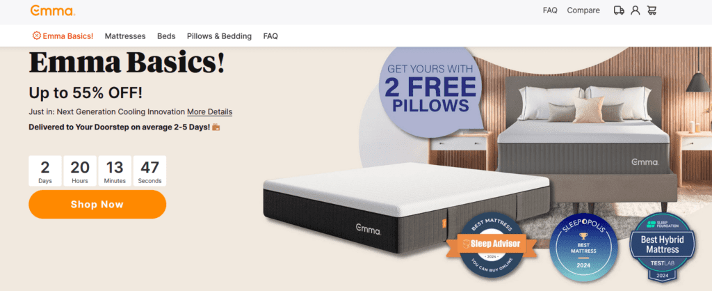 Some companies also leverage this in the form of displaying badges that represent various certifications or awards. And this detail added to your home page can instantly boost your brand’s credibility. Like the eye-grabbing badges right below the hero image on the homepage of a popular mattress company, Emma. These details showcase industry recognition for your product/brand and encourage potential customers to consider your brand over competitors.