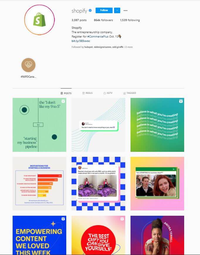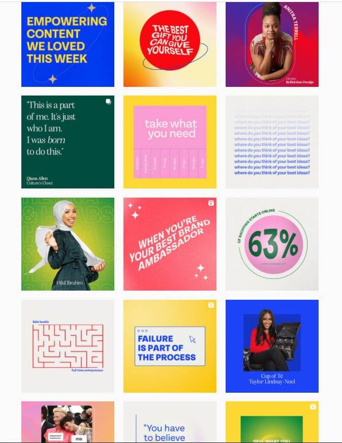 Take the Shopify feed, for example. Shopify shares a lot of text-heavy posts such as statistics, carousel posts, and other static images. But it does not shy away from featuring text. Instead, Shopify has created an entire aesthetic using colorful backgrounds that support its brand identity while championing text based posts too.