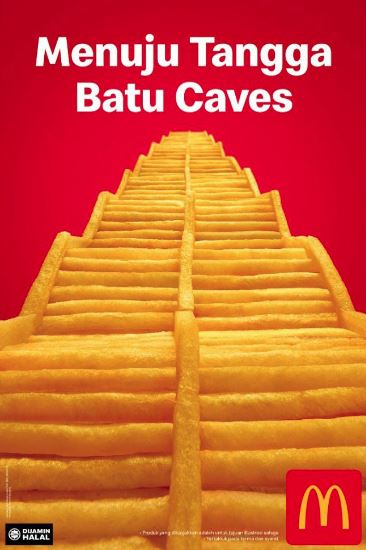 Take a look at the below outdoor ad for example. This ad was designed for McDonald’s Malaysia as a creative representation of a local landmark, Batu Caves. The use of a popular local landmark means that the ad instantly connects with the locals. The use of signature elements like fries and the well-recognized brand color combination of red and yellow preserve the brand identity.