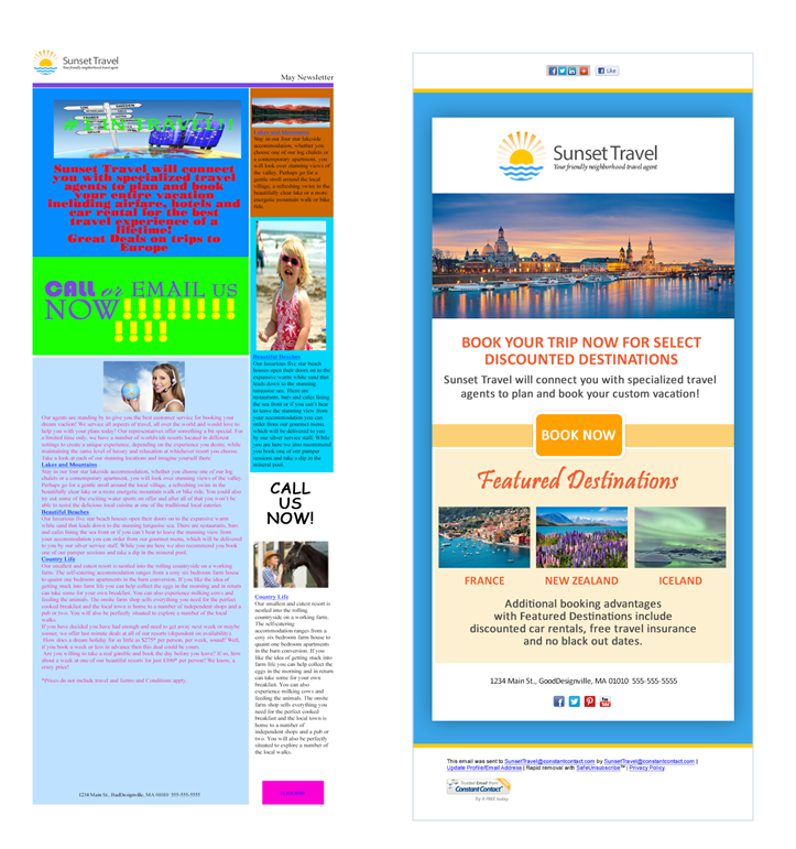 The bizarre combination of colors on the left makes the email uncomfortable to read. Whereas the simple color palette on the right is much easier to read.