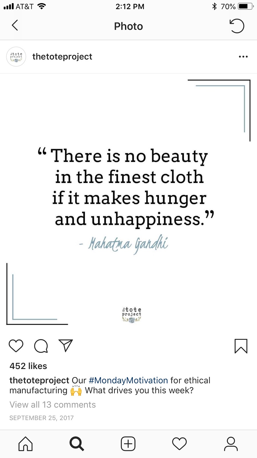 The Tote Project’s social media posts always tie back to their mission. They want to end trafficking through spreading awareness, ethical manufacturing and also through giving back. Now the takeaway here is not that you must give away a certain amount of money. Or that you have to adopt a social enterprise business model to have a good story to tell. But if you focus on giving back to a cause that your customers are also invested in, you will not only get their attention. You’ll also get their investment in your mission and vision.