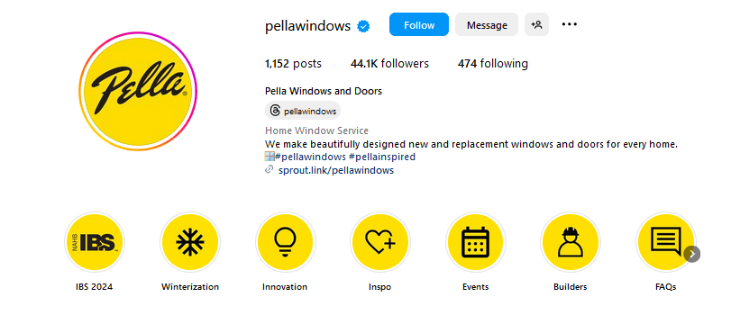 The below image is a snapshot of the Instagram page of a popular windows and doors manufacturer Pella. The signature brand color, yellow – appears on the profile picture and on the Story Highlight cover images. The rest of their grid also looks organized and they use clear templates to ensure a visually cohesive experience for every visitor.