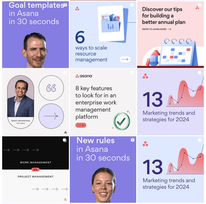 For example, the below image is a glimpse of the Instagram page of Asana, one of the most popular project management tools in the market. Notice how the brand uses on-brand custom graphics to create a visually immersive grid of informative posts. Striking social media graphics like these are sure to impress the first-time visitor and the existing audience alike.
