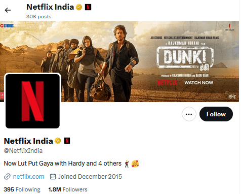 The below image is a snapshot of what the Netflix India page looks like on X. The Bio and the cover image are in tune with a big movie release anticipated by a majority of the Indian audience. Little optimization details like these can make a global brand appear more approachable to the local audience.